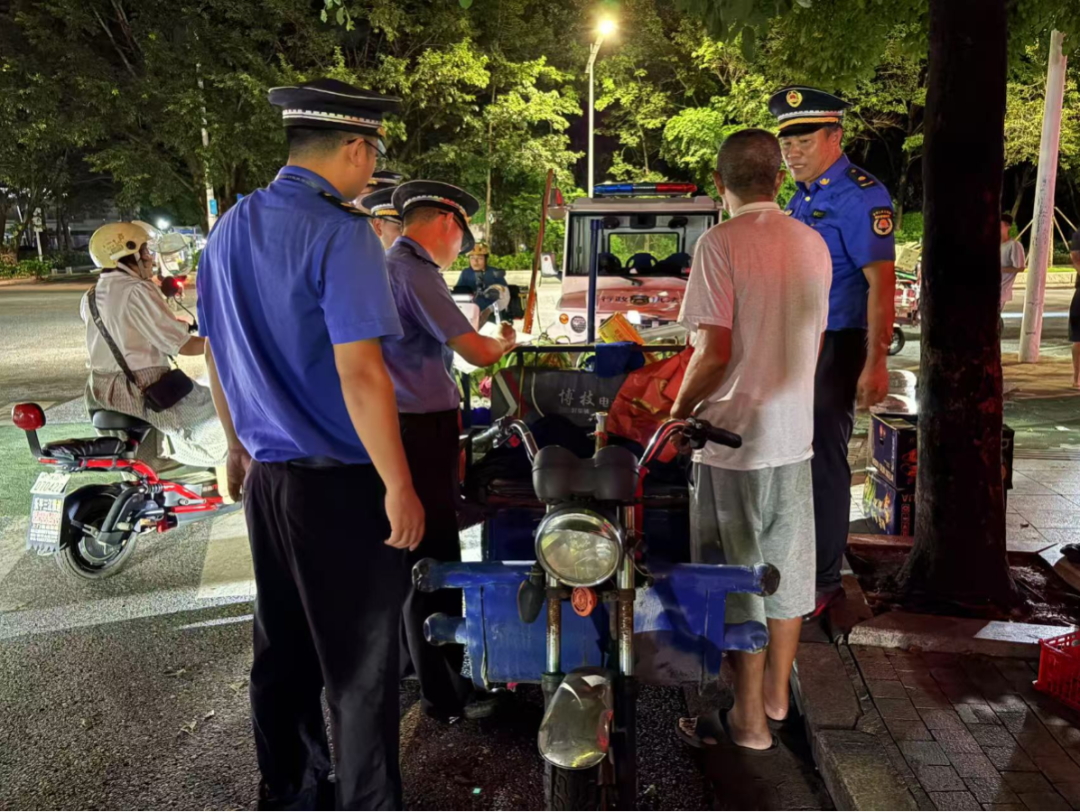 执法队通过定点检查与流动巡查相结合的方式开展执法行动。行动前,执法人员发放了70多份《禁止摆卖通知》,劝导商贩自行整改。行动当晚,29名执法人员组成精锐队伍,8台执法车辆整齐待命,直奔时代南湾、招商御园、建设一路、建设二路等重点区域,当场派出相关整改文书8套,查处违法行为8起。对占道经营行为亮证告知违法事实,责令现场整改;对屡劝不改者依法依规予以处罚。此次行动中,执法人员全程规范文明执法,严格遵循法定程序。